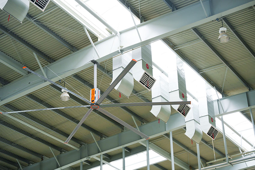 工業(yè)大風(fēng)扇:在車間高空位置安裝大功率工業(yè)風(fēng)扇,通過大風(fēng)量的氣流循環(huán),將冷風(fēng)機(jī)產(chǎn)生的冷風(fēng)更有效地散布到車間的每個(gè)角落,同時(shí)促進(jìn)車間內(nèi)空氣的流通,避免局部高溫和悶熱。
